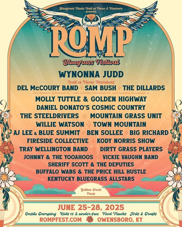 Description: ROMP Fest in Owensboro, KY, is a four-day bluegrass and roots music festival held at Yellow Creek Park, featuring over 20 bands, workshops, and family-friendly activities. Celebrating community and bluegrass heritage, it blends live performances with cultural experiences like instrument workshops, local crafts, and on-site camping.