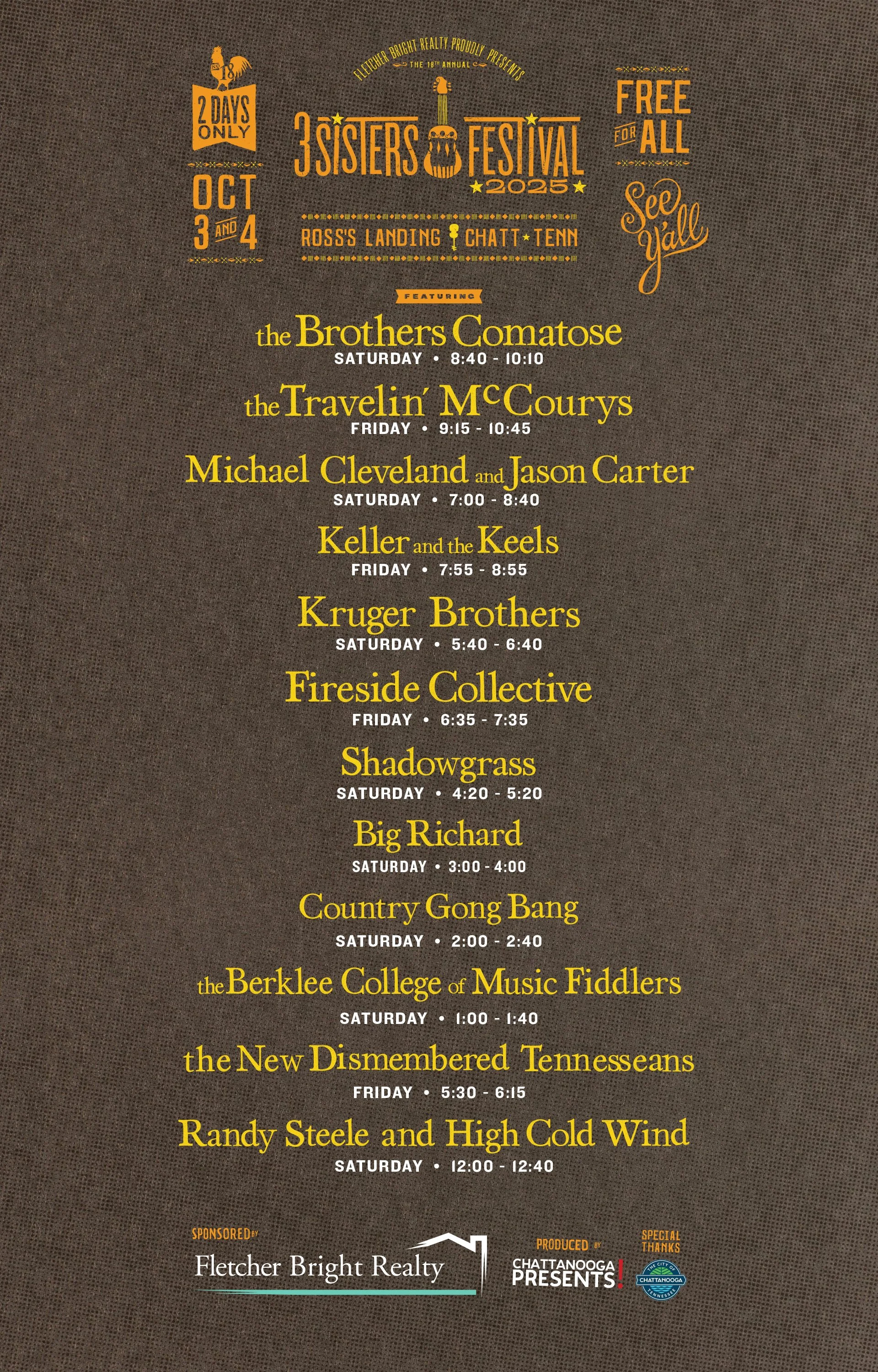 Find more information about tickets, schedules, full lineups, camping information, and more at the 3 Sisters Bluegrass Festival website.